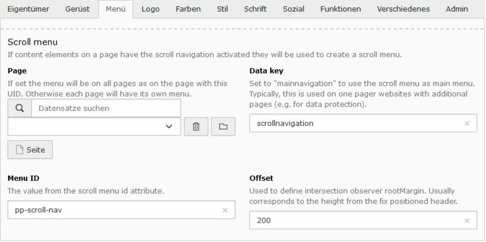 Den Inhaltselementen wurden Eigenschaften zur Erstellung eines Scrollmenüs hinzugefügt. Somit kann durch einfaches aktivieren der Scrollnavigation ein Eintrag dem Scrollmenü hinzugefügt werden. Der Menütext entspricht der Überschrift oder eines eigenen Textes. Bei Bedarf kann die Menüposition durch ein separates Feld bestimmt werden.